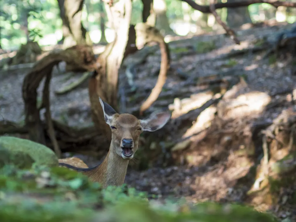 Adding to its magical atmosphere, deer freely wander through the trees.